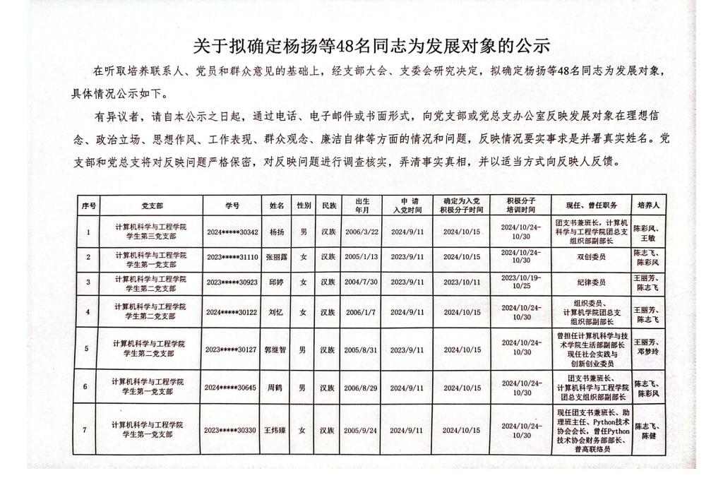 关于拟确定杨扬等48名同志为发展对象的公示