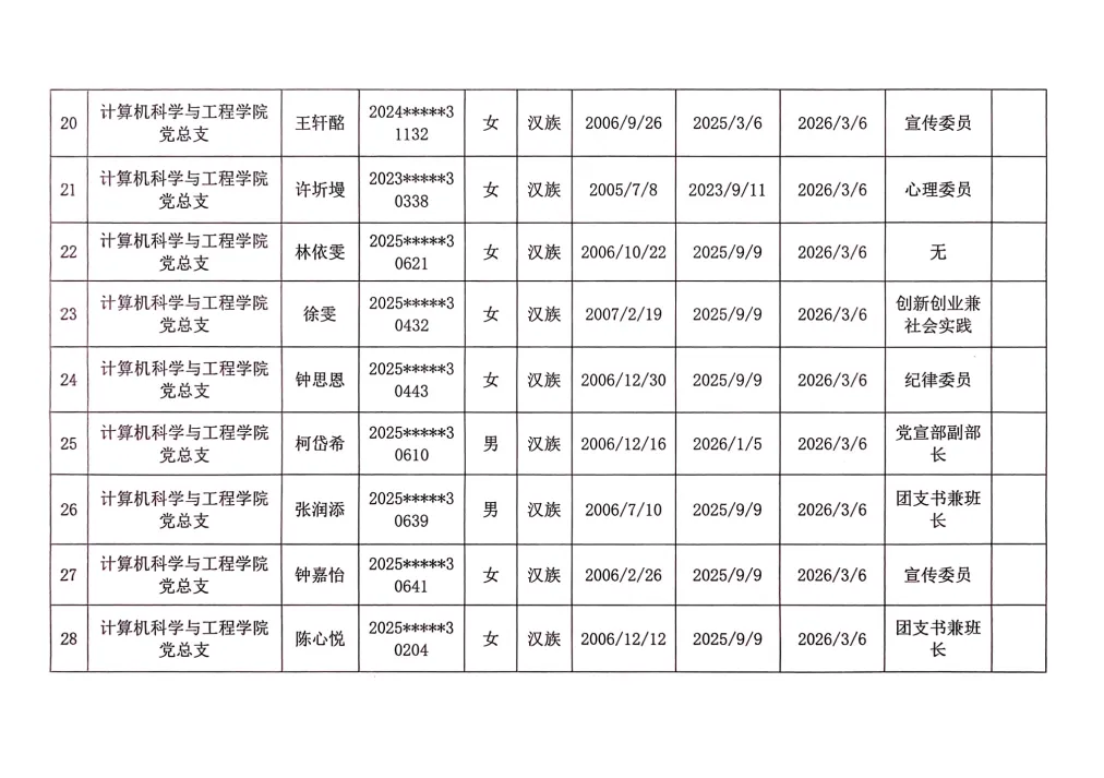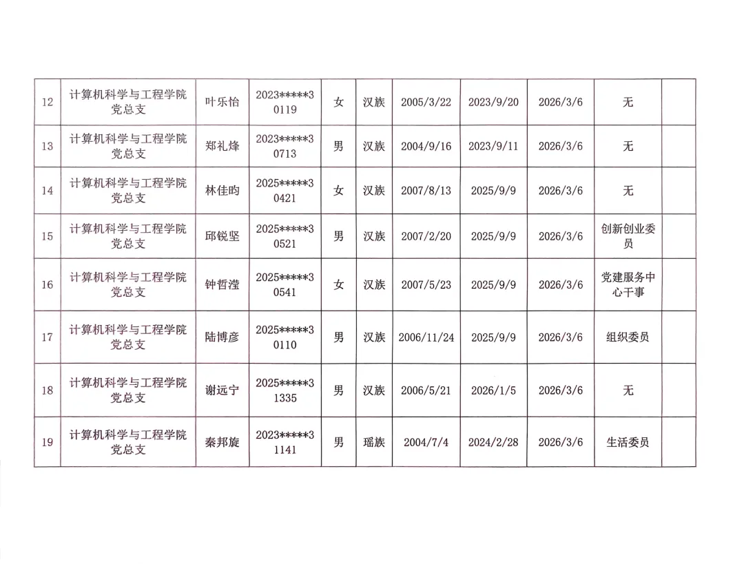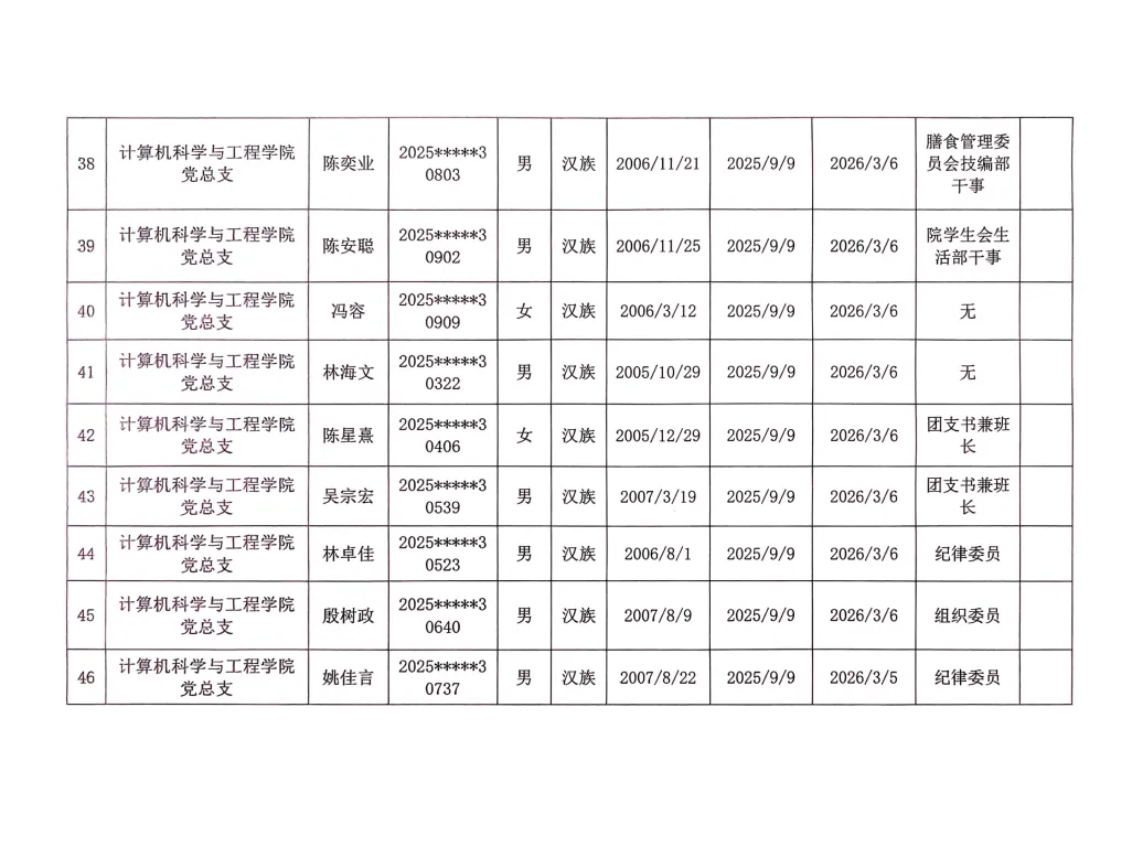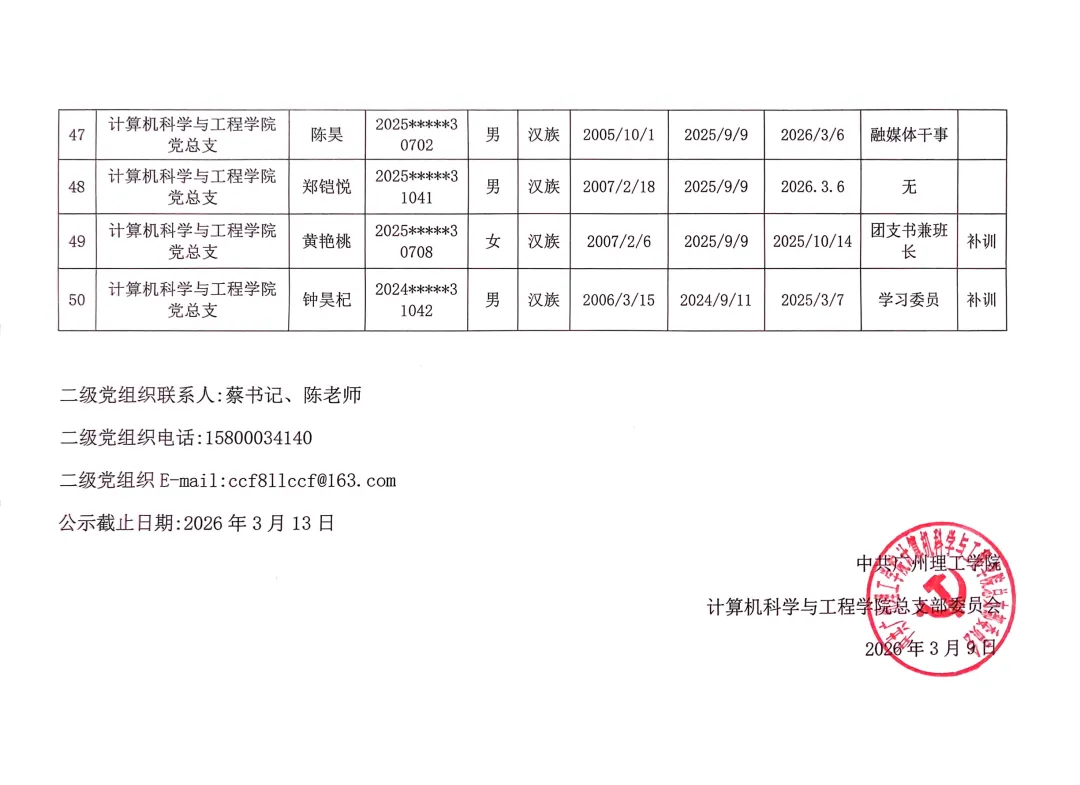 在听取培养联系人、党员和群众意见的基础上,经支部大会、支委会研究决定,拟确定程威霖等50名同志为入党积极分子,具体情况公示如下。