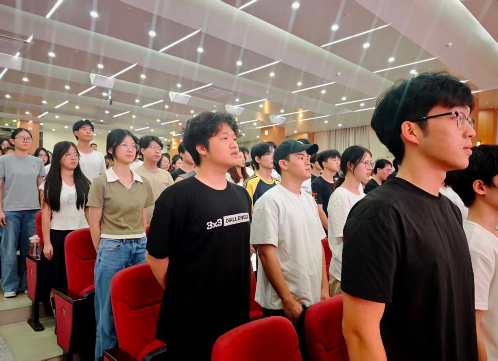 全场起立,全体发展对象神情庄重肃穆,面向国旗行注目礼,现场氛围庄重而热烈,充分展现了开云kaiyun体育官方网站发展对象坚定的政治信仰与良好的精神风貌。