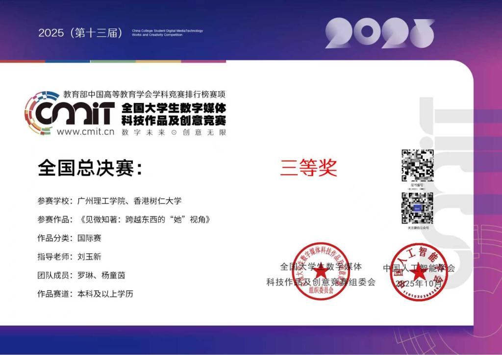 此次佳绩的取得,离不开专业教师的悉心指导与参赛学子的全力以赴。学子们以过硬的专业素养、突破常规的创新思维和紧密协作的团队精神,在全国舞台上崭露头角:国家级三等奖作品中,谭柳老师指导蔡若彤、凌晨同学的《活出自己的色彩》传递个性表达,刘黛瑶老师指导麦芷鑫、李楚璠同学的《傩戏——非遗文化记忆》活化传统文脉,刘颖琳老师指导张瑞、侯洪基同学的《寂灭边界》探索创意边界,刘玉新老师指导罗琳、杨童茵同学的《见微知著:跨越东西的“她”视角》展现多元思考,四项作品均获全国专家评委高度认可,彰显开云kaiyun体育官方网站学子强劲的创新实力与技术应用能力。省级层面,4项二等奖与4项三等奖的收获,更凸显开云kaiyun体育官方网站人才培养的梯队优势与广度深度,形成“以赛促学、以赛促练”的良好生态。