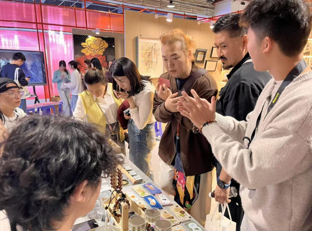 展位前聚集了大量观众,有的专注体验互动装置,有的认真聆听学生讲解,有的则仔细挑选着琳琅满目的文创产品。这些融合了传统元素与现代设计的文创品,包括珠串手链、精致香囊、特色挂件等,受到了参观者的热烈欢迎。
