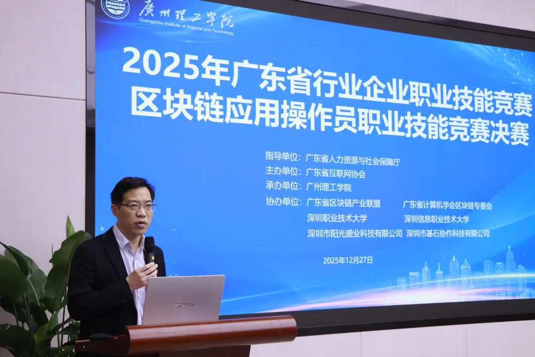 12月27日,2025年广东省行业企业职业技能竞赛-区块链应用操作员职业技能竞赛在广州理工学院举行。广州理工学院副校长张日新,广东省互联网协会秘书长徐强、广州市大湾区智能科技人才联合会副理事长李中华、广东省计算机学会区块链专业委员会副主任委员兼秘书长黄建新、联想教育集团产教融合负责人吴洋、广东电信规划设计院正高级工程师庞志鹏等出席了开幕式。全省各单位参赛队伍、行业专家及院校代表七十多人,计算机科学与工程学院全体领导班子共同见证赛事启动。开云kaiyun体育官方网站、人工智能与数字经济产业学院副院长陈易平主持开幕式。