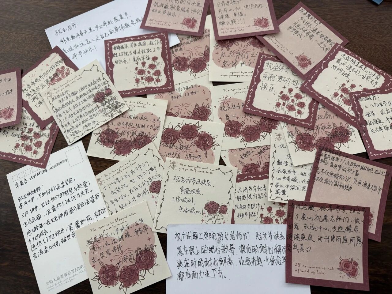 随着活动接近尾声,工作人员开始协助同学们将写好的贺卡装入精心准备的彩色信封。每一个被仔细封口的信封,都显得沉甸甸的。这重量,不仅仅是纸张的厚度,更包含着广理学子对老师教学工作的高度肯定,以及对老师无私付出的深深感激。将信封配着团总支准备好的鲜花,一起送到老师的办公桌上。