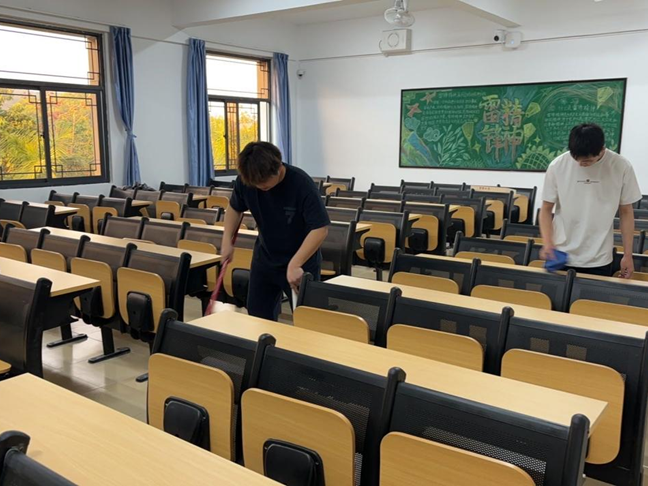 打扫过程中,同学们热情高涨、分工协作、默契配合,展现出新时代青年学子的良好风貌。大家不怕脏、不怕累,有的弯腰俯身清扫地面碎屑与污渍,不放过任何卫生死角;有的手持抹布,细致擦拭桌面、讲台、黑板及门窗玻璃,让每一处都焕然一新;有的整理课桌椅,将桌椅摆放得整整齐齐,规范收纳清洁工具;还有的同学仔细清理桌兜内的杂物,擦拭多媒体设备周边灰尘,全力保障教学设施整洁完好。整个打扫现场井然有序,同学们忙碌的身影穿梭在各个教室,成为春日校园里一道温暖的风景线。
