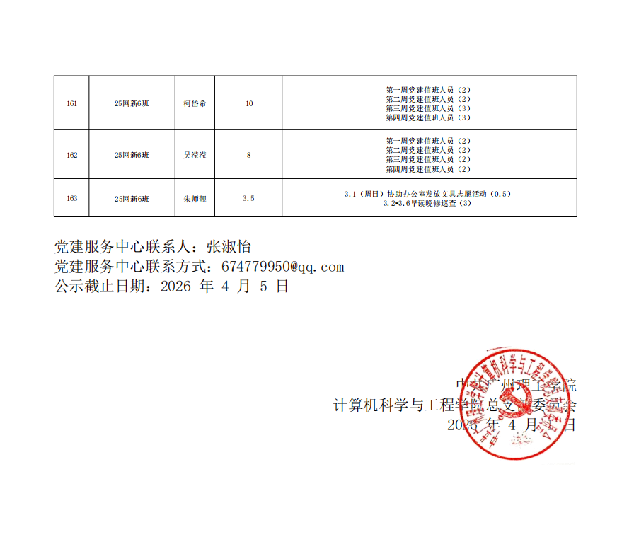 党建服务中心联系人:张淑怡党建服务中心联系方式:674779950@qq.com党建服务中心:4栋信息楼609室公示截止时间:2026年4月5日