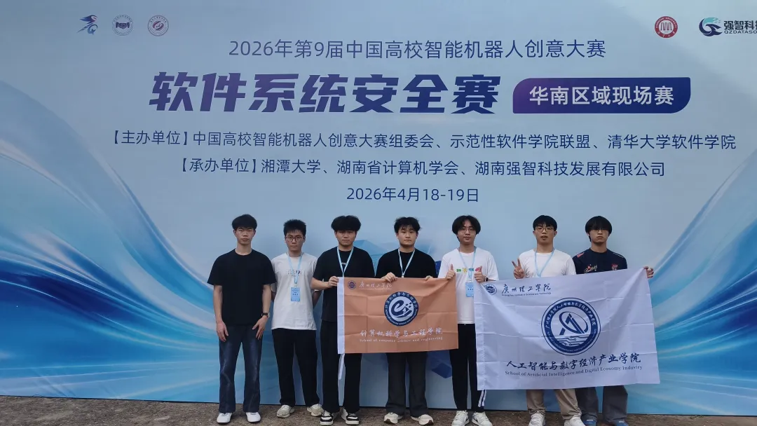 2026年4月19日,第9届中国高校智能机器人创意大赛——软件系统安全赛(华南区域现场赛)在湖南湘潭圆满落幕。由开云kaiyun体育官方网站郑俊嫦老师指导的23网工1班刘飞翔、朱烁群以及25网工1班钟灏荣组成的广州理工学院第3队;23软件6班朱定基、23网工1班李志、郑育轩和25网工1班汪锐涵组成的广州理工学院第6队,在众多顶尖高校队伍中脱颖而出,双双斩获华南区域赛一等奖,成功晋级全国总决赛,尽显广理学子硬核实力与科创风采。