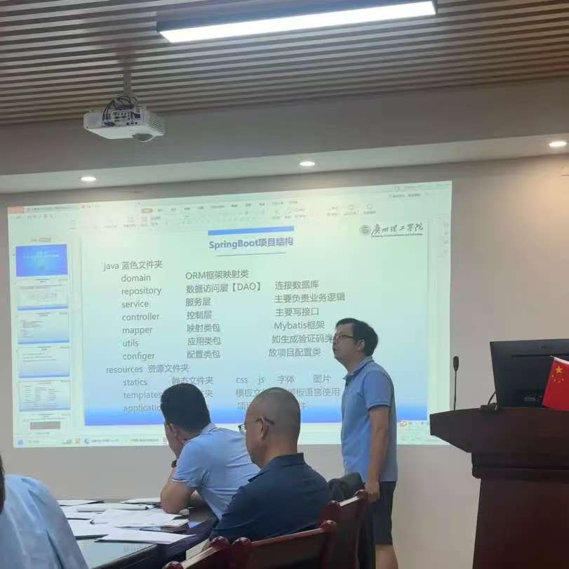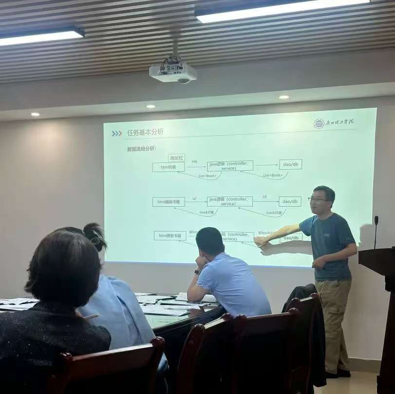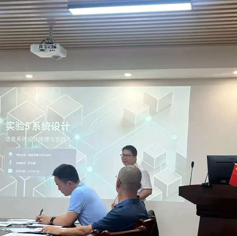 会议期间,刘肖肖、游棉州、雷海波、甘伟光、李粘粘、李旭章、李鉴仪等7位教师依次进行授课展示,内容覆盖《大数据技术基础》《高级架构技术》《大学信息技术与人工智能基础》《软件项目管理》《模式识别》等多门课程,教学专家与课程组长组成点评组,围绕教案规范性、课程思政融入、AI 技术应用、课堂节奏把控、实操引导等方面进行细致点评,既肯定亮点做法,也直指薄弱环节,现场提出优化思路与改进建议,实现 “展示 — 点评 — 提升” 一体化推进。磨课过程务实高效,充分体现以磨促教、以研促长的理念。