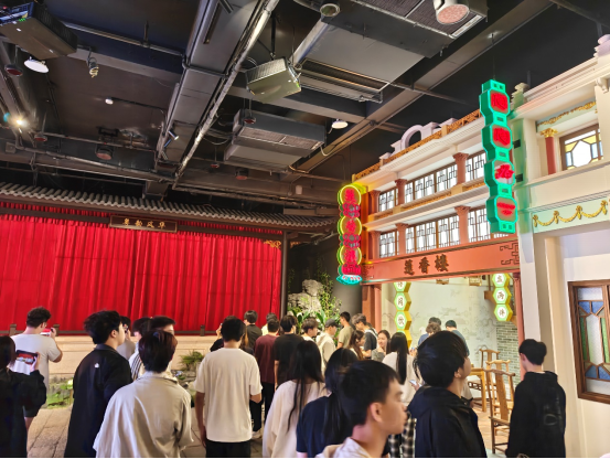 文旅应用展示区域,师生重点参观并体验非遗文化互动展示场景——该场景以灯光技术、影像投射与智能控制系统为核心支撑,将传统非遗元素转化为沉浸式、可互动的展示内容,让师生在光影交织中直观感受传统文化的独特韵味与时代活力。