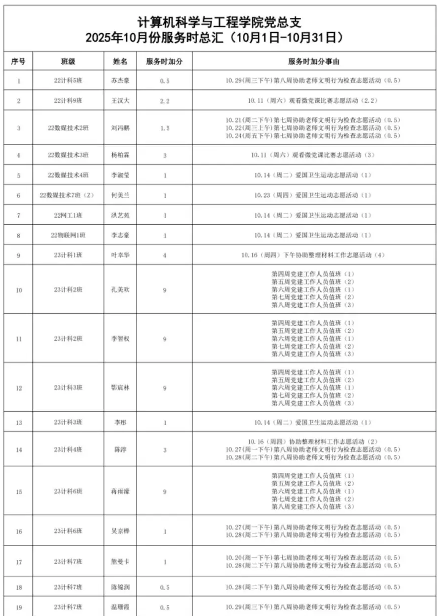 在听取培养联系人、党员和群众意见的基础上,经支委会研究决定,每月对计算机科学与工程学院各个发展阶段的同志进行服务时公示,具体情况公示如下。