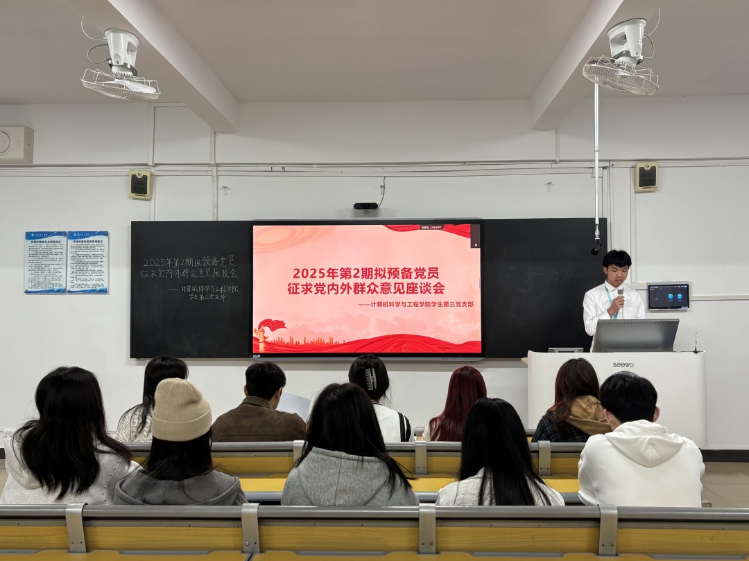 11月20日晚上,计算机科学与工程学院学生第一、二、三党支部在6-301、6-302、6-303B召开2025年第2期拟预备党员征求党内外群众意见座谈会。本次会议采用线上线下相结合的形式进行。学生第三党支部书记陈彩风同志、学生第一、二、三党支部副书记、全体党员同志、36名拟预备党员及学生党支部工作人员按时参会。