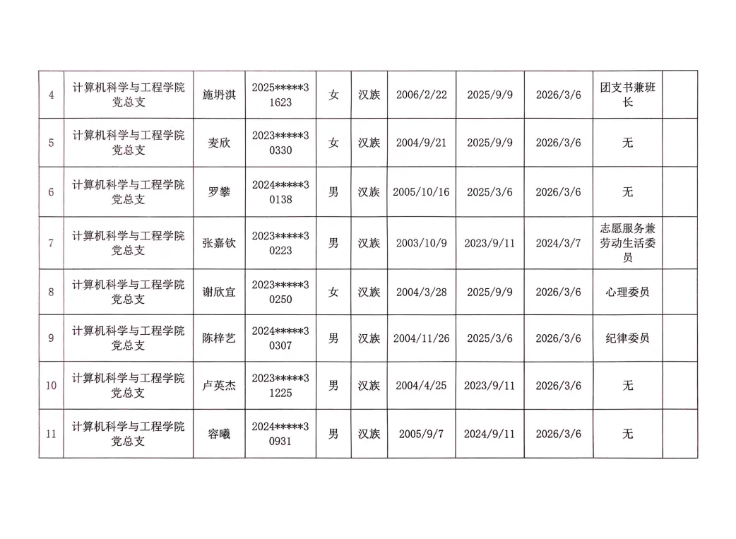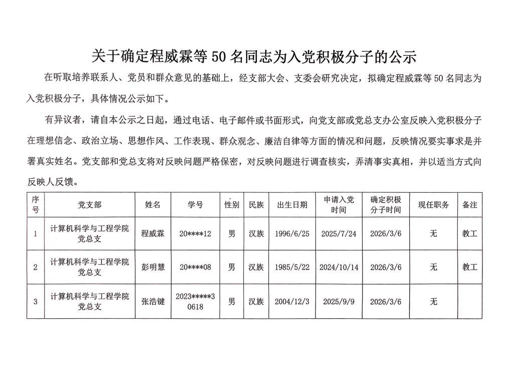 在听取培养联系人、党员和群众意见的基础上,经支部大会、支委会研究决定,拟确定程威霖等50名同志为入党积极分子,具体情况公示如下。