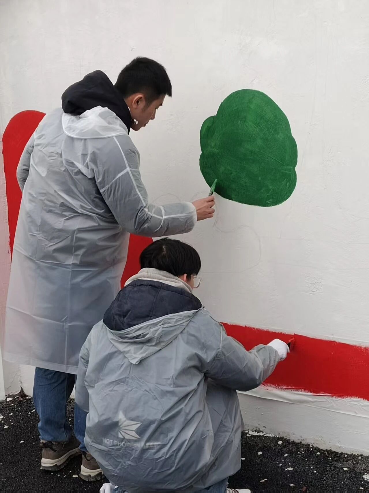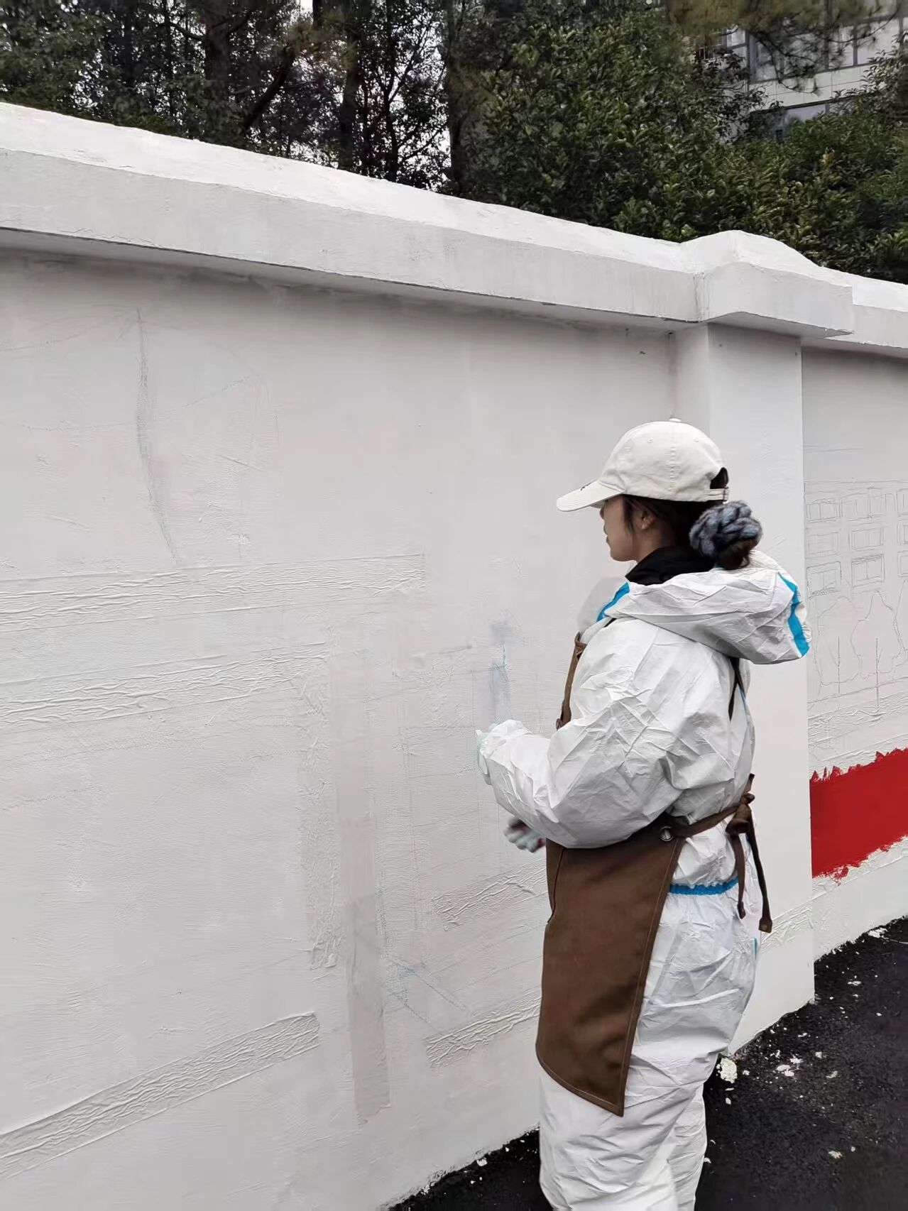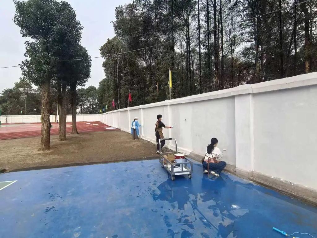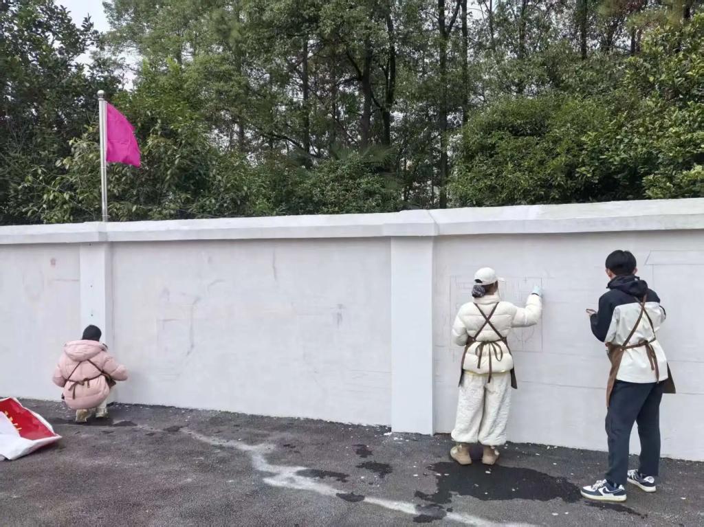 本次墙绘围绕入校启航、奋斗进阶、担当实践、远方未来四大主题板块展开,将成长轨迹、校园精神与理想追求融入画面,让每一面墙都会说话,让每一处景都能育人。1月27日开工第一天,团队率先开展墙面清理与底漆涂刷工作。大家分工协作、细致作业,为后续起稿与上色打下平整牢固的基础,用认真与专注开启这场艺术创作之旅。