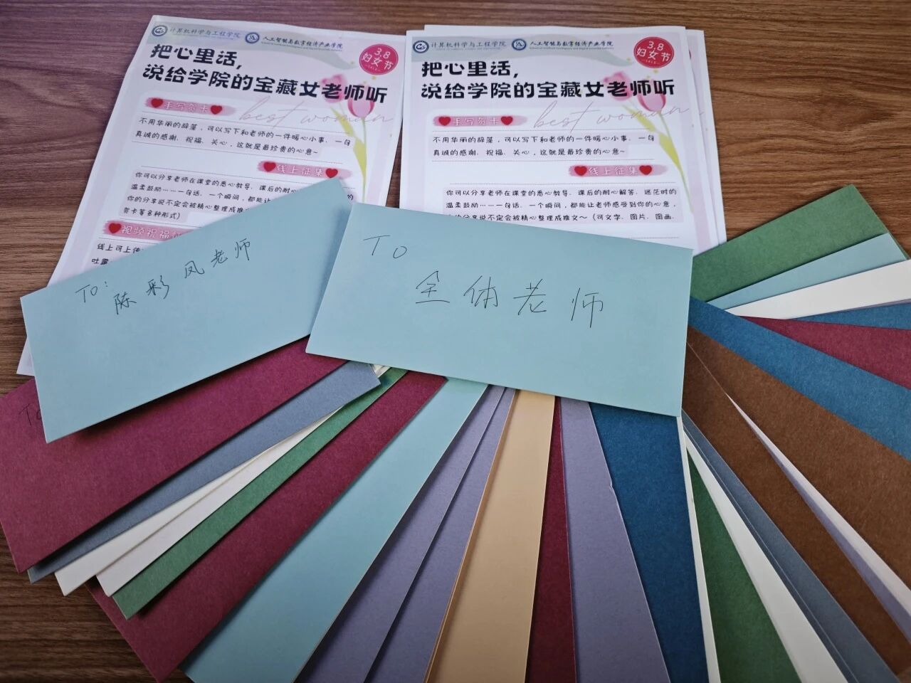 随着活动接近尾声,工作人员开始协助同学们将写好的贺卡装入精心准备的彩色信封。每一个被仔细封口的信封,都显得沉甸甸的。这重量,不仅仅是纸张的厚度,更包含着广理学子对老师教学工作的高度肯定,以及对老师无私付出的深深感激。将信封配着团总支准备好的鲜花,一起送到老师的办公桌上。