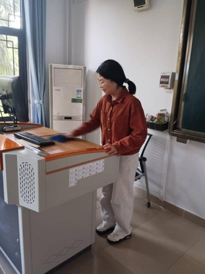打扫过程中,同学们热情高涨、分工协作、默契配合,展现出新时代青年学子的良好风貌。大家不怕脏、不怕累,有的弯腰俯身清扫地面碎屑与污渍,不放过任何卫生死角;有的手持抹布,细致擦拭桌面、讲台、黑板及门窗玻璃,让每一处都焕然一新;有的整理课桌椅,将桌椅摆放得整整齐齐,规范收纳清洁工具;还有的同学仔细清理桌兜内的杂物,擦拭多媒体设备周边灰尘,全力保障教学设施整洁完好。整个打扫现场井然有序,同学们忙碌的身影穿梭在各个教室,成为春日校园里一道温暖的风景线。